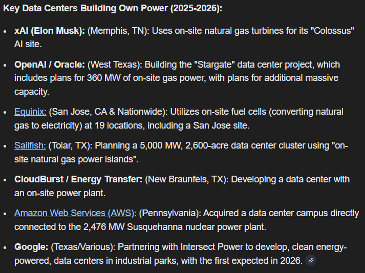 You havenât disproved anything I said. Notice how many of those either donât exist yet or are purchasing their power. Those with onsite power are going to be built and run by utility companies. So as I said, even those that donât share their power are sharing the burden. And even if you can find a few exceptions, with over 10000 data centers, it is simply untrue to make the blanket statement: